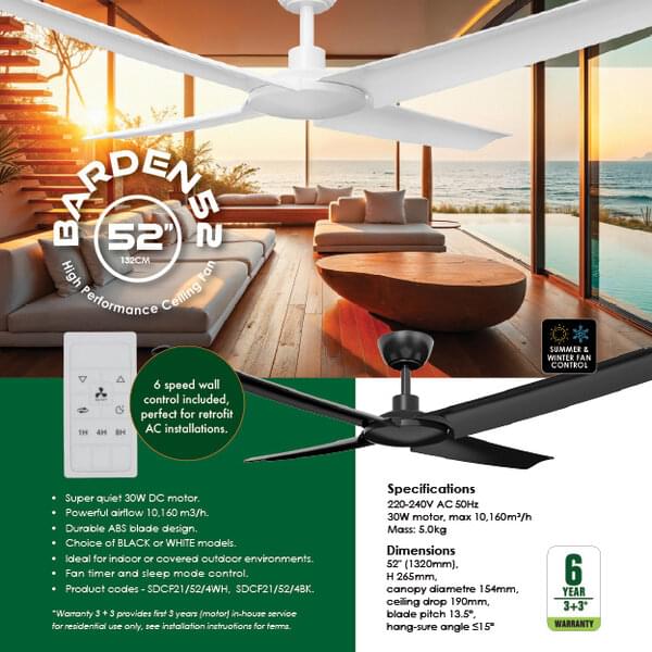 With a durable 52" ABS blade design, summer and winter fan control and a choice of black or white models, the BARDEN 52 is ideal for indoor or covered and protected outdoor residential environments.