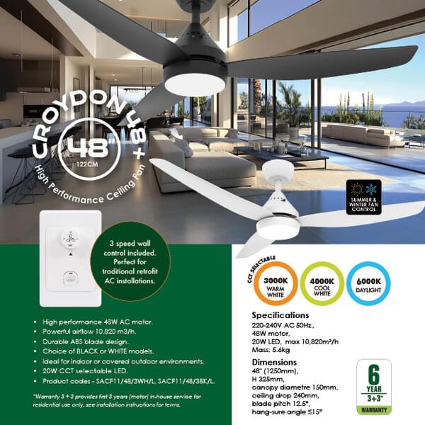 With a durable 48" ABS blade design, summer and winter fan control and a choice of black or white models, the Croydon 48+ is ideal for indoor or covered and protected outdoor residential environments.