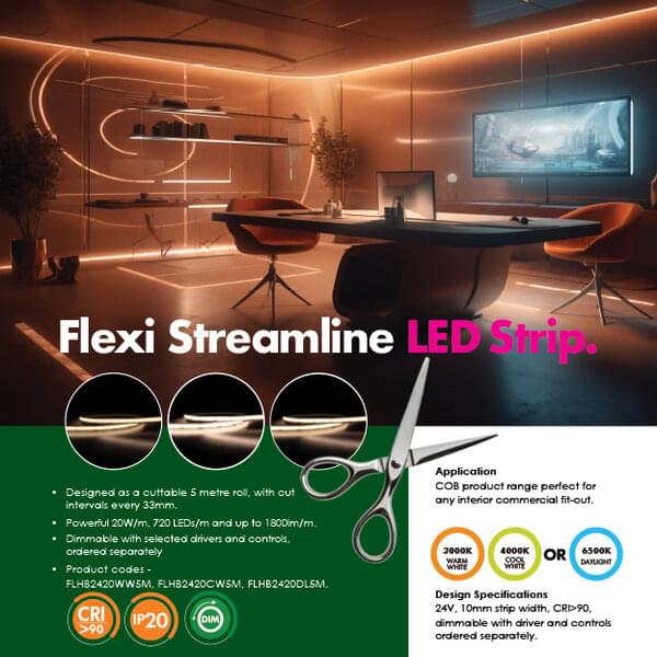 The versatile FLEXI STREAMLINE LED strip is designed as a cuttable 5 metre roll in 33mm intervals and is available in a choice of 3000/4000 or 6500K CCT.
