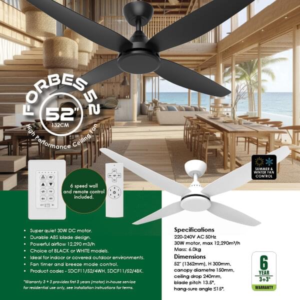 With a durable 52" ABS blade design and a choice of black or white models, the FORBES 52 is ideal for indoor or covered and protected outdoor residential environments.