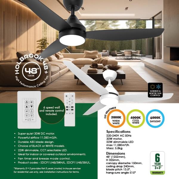 The innovative design incorporates a six-speed wall and remote control, with fan timer and breeze mode controls and selectable CCT 22W dimmable LED.